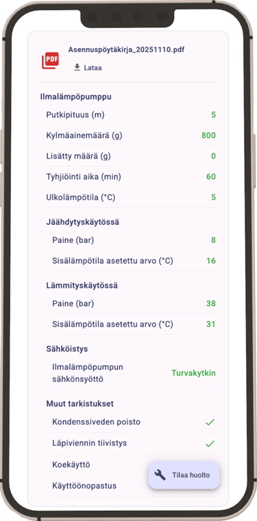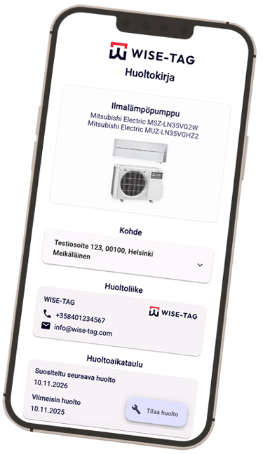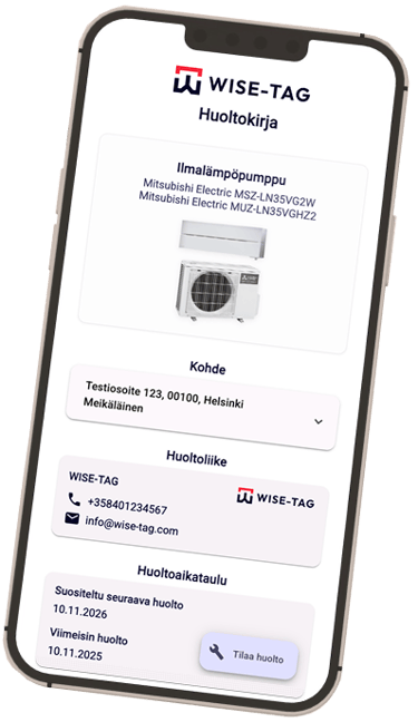 Lämpöpumppuun kiinnitetty QR-koodi avaa suoraan laitteen sähköisen huoltokirjan, josta löytyvät kaikki keskeiset tiedot: asennuspäivä, tehdyt huollot, vaihdetut osat sekä tulevat huoltosuositukset. Käyttäjä voi tarkistaa ajantasaiset tiedot nopeasti, ja huoltoliike voi päivittää huoltomerkinnät paikan päällä vain muutamalla napautuksella.