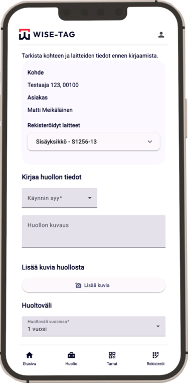 Järjestelmä toimii helppokäyttöisenä PWA-sovelluksena, johon kirjaudutaan nopeasti suoraan puhelimella ilman erillistä asennusta. Näin huoltotiedot ovat aina helposti saatavilla ja päivitettävissä riippumatta laitteesta tai käyttöympäristöstä.